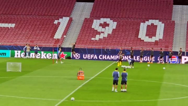 马德里德比战大胜对手后,马竞又跑到大都会球场练手了。明天他们就要在这儿跟法兰克福展开欧冠联赛阶段第2轮的较量。不过呢,跟之前训练一样,西蒙尼这老狐狸还是不肯透露他的战术小秘密。